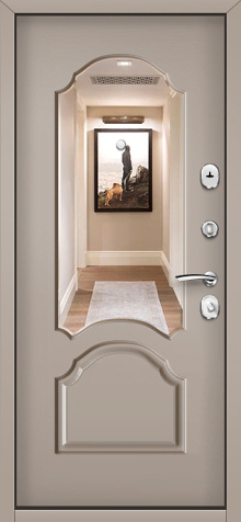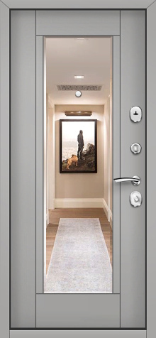Если входная дверь в квартиру с зеркалом планируется в светлом интерьере, обратите внимание на «белые входная дверь с зеркалом»: светлые фактуры визуально убирают массивность металла, а зеркало «поддерживает» горизонтальные линии мебели и света.