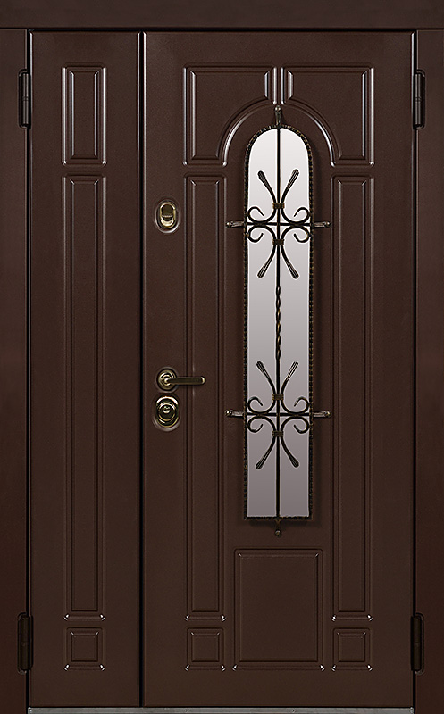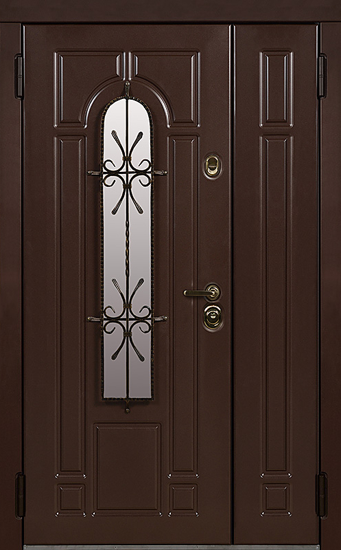 Эта металлическая двухстворчатая дверь с арочным стеклопакетом №15 представляет собой идеальный баланс между эстетикой и прочностью. Арочное стекло добавляет в её дизайн утончённость, а ковка в декоре придаёт изысканный, но в то же время крепкий и надёжный вид. Плита МДФ, используемая как для внешней, так и для внутренней отделки, не только сохраняет прекрасный внешний вид, но и устойчива к механическим повреждениям. Металлическая двухстворчатая дверь с арочным стеклопакетом №15 от производителя: быстрое изготовление и монтаж в Ногинске, индивидуальные размеры, широкий выбор материалов и фурнитуры, официальная гарантия до 10 лет.
