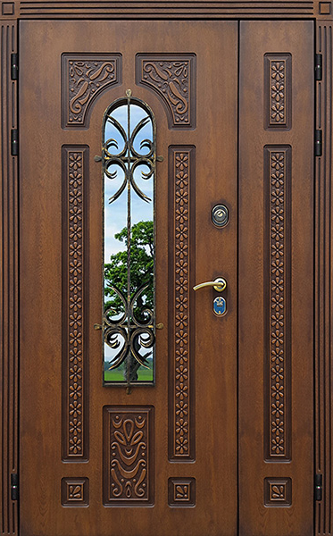 Двойная входная дверь с большим стеклом и ковкой для дома №25 сочетает в себе стиль и надежность, предлагая великолепное решение для вашего дома. Внешняя и внутренняя отделка выполнены из панелей МДФ с ПВХ, что придает двери долговечность и устойчивость к механическим повреждениям, а также способствует легкости ухода. Стеклопакет в комбинации с изысканным кованым узором создаёт не только эстетическое наслаждение, но и позволяет улучшить светопроникновение в помещении. Двойная входная дверь с большим стеклом и ковкой для дома №25 от производителя: быстрое изготовление и монтаж в Ногинске, индивидуальные размеры, широкий выбор материалов и фурнитуры, официальная гарантия до 10 лет.