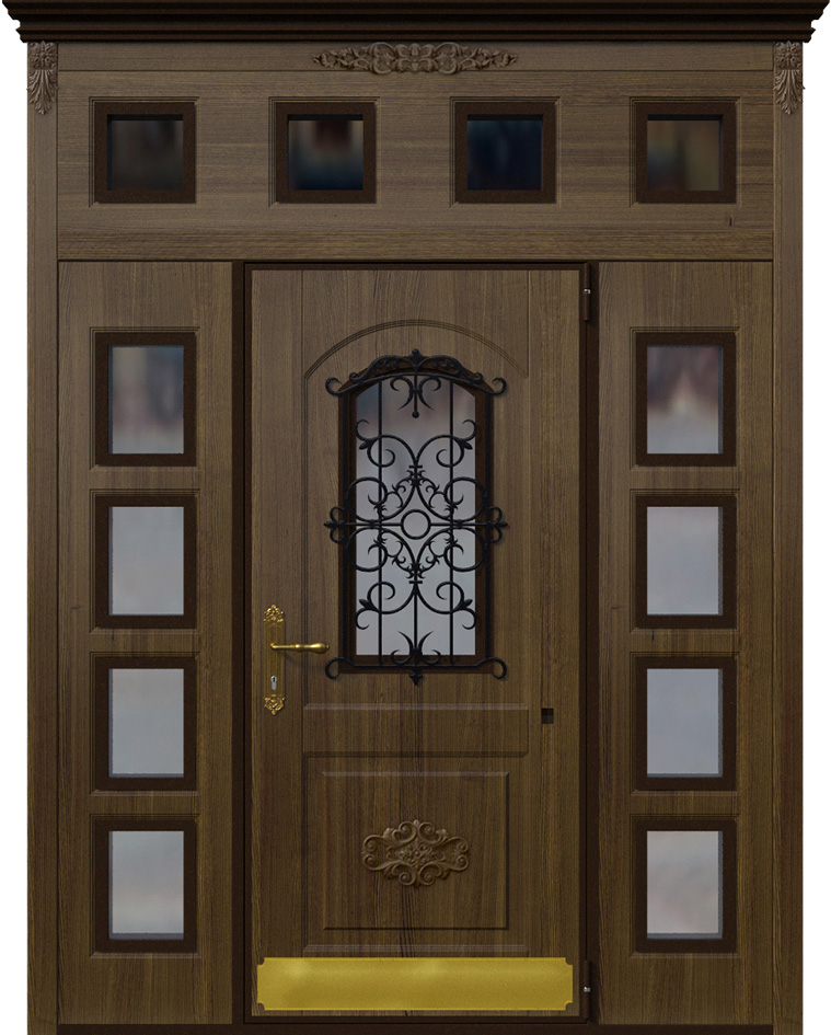 Эта модель выделяется своим масштабом и декоративностью: двухстворчатая дверь со вставками и ковкой №2 подчеркивает парадность входа и придает фасаду респектабельность. Основу составляет прочный каркас из стальных профильных труб с листом металла толщиной 2 мм и ребрами жесткости, что обеспечивает долговечность и защиту. Снаружи и внутри полотно облицовано накладками МДФ, которые позволяют воплотить различные варианты текстур и оттенков, сохраняя устойчивость к механическим повреждениям и влиянию внешней среды. Кованые элементы вносят в образ двери нотку изысканности и индивидуальности, делая ее центральным акцентом всего фасада. Для безопасности предусмотрены два замка турецкого производителя Kale Kilit — цилиндровый и сувальдный, каждый с ригелями, усиливающими защиту. Такая дверь сочетает надежность металлической конструкции с эстетикой классического дизайна, превращая вход в настоящий архитектурный акцент. Двухстворчатая дверь со вставками и ковкой №2 от производителя: быстрое изготовление и монтаж в Ногинске, индивидуальные размеры, широкий выбор материалов и фурнитуры, официальная гарантия до 10 лет.